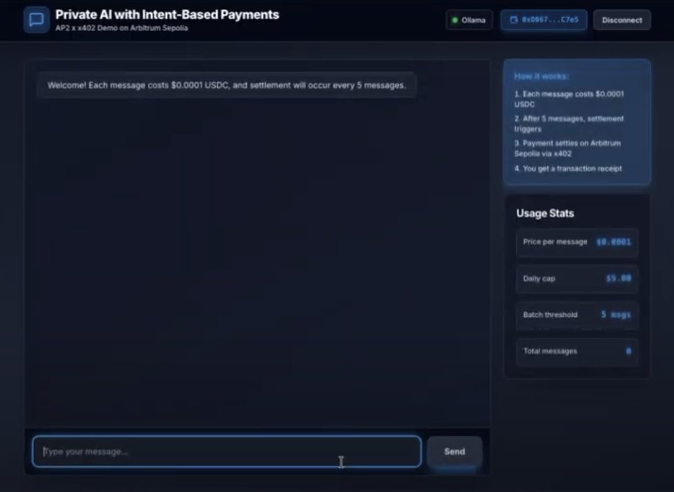 The private inference demo shows a full x402 v2 flow end to end, including header-based requirements, explicit authorization signing, batching, and settlement on Arbitrum. It’s designed to be read, modified, and broken on purpose.