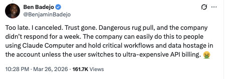 One reply from @BenjaminBadejo summed up the mood: “Too late. I canceled. Trust gone. Dangerous rug pull, and the company didn’t respond for a week. The company can easily do this to people using Claude Computer and hold critical workflows and data hostage unless the user switches to ultra-expensive API billing.”
