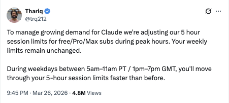 Anthropic just changed how fast your 5-hour session limits burn during peak hours. No warning. No opt-in. Just a tweet from Thariq and a wave of canceled subscriptions.
