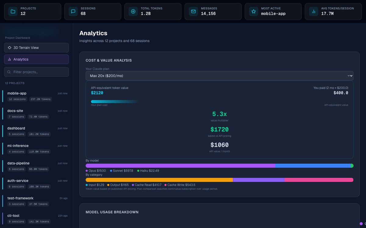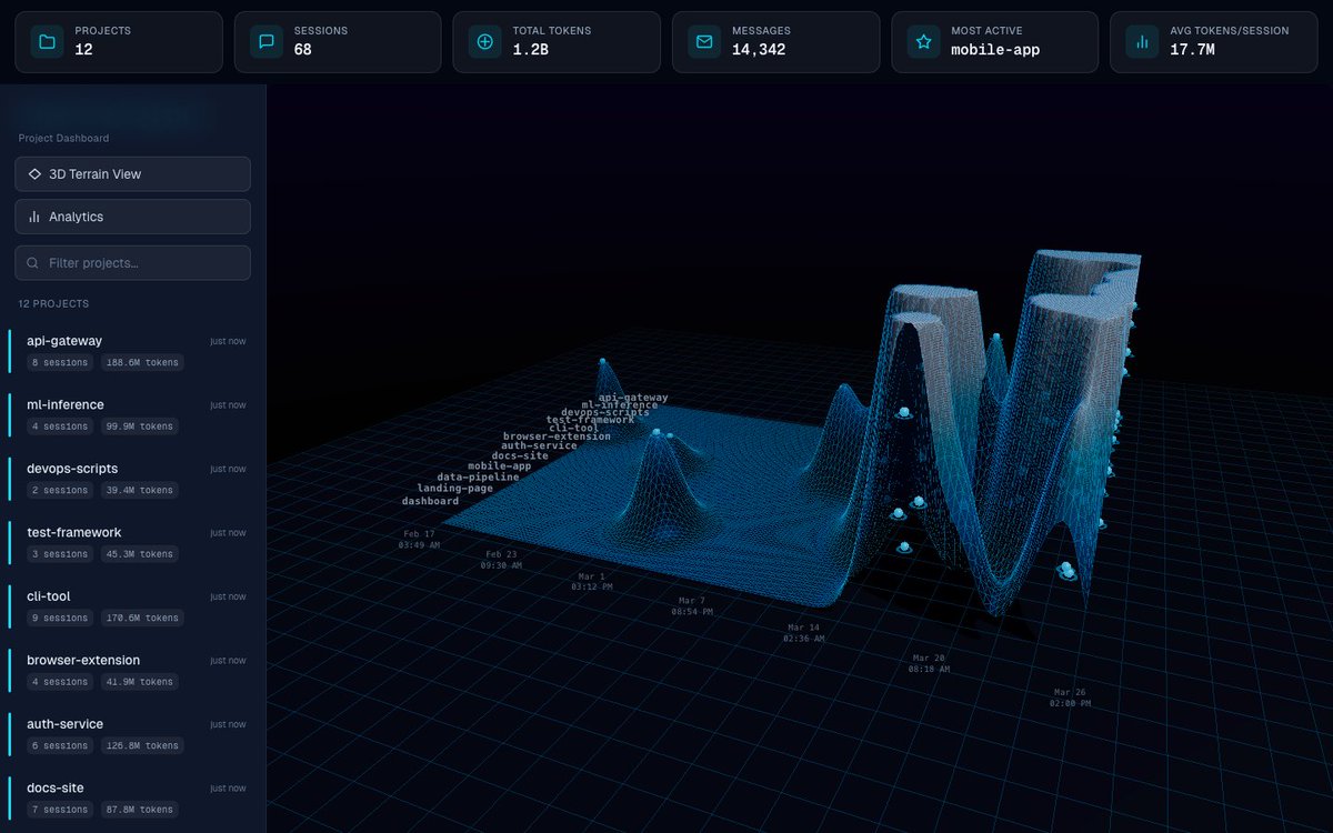 The 3D terrain view maps your token usage across projects over time. Peaks show where you’re burning through context. The project sidebar tells you exactly how many sessions and tokens each repo has consumed.